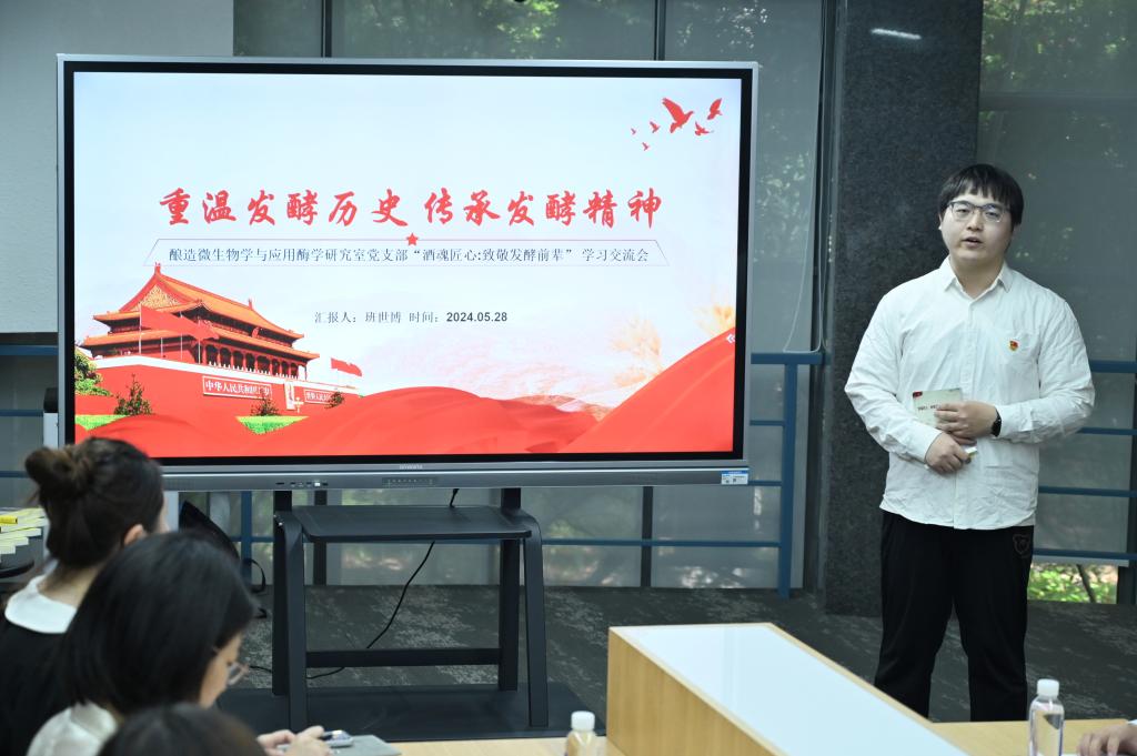 交流会在PA视讯官方网站酒科技馆举办,旨在带领师生沉浸式体悟发酵之光、学科力量。通过回顾第106期朱宝镛大讲堂暨中国酿酒大师访谈会现场,引出“致敬发酵前辈 吾辈勇担使命”的交流话题。党支部成员、2021级博士生班世博以“重温发酵历史 传承发酵精神”为主题展开分享,讲述中引经据典,带领师生重温那段峥嵘岁月,结合科研实际,他提到“发酵工程领域的前辈们引领发酵学科前进,作为行业后辈,当以前辈为榜样,站在巨人的肩膀上发奋图强。”