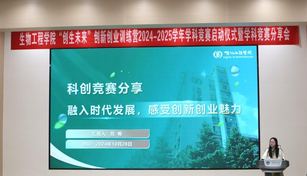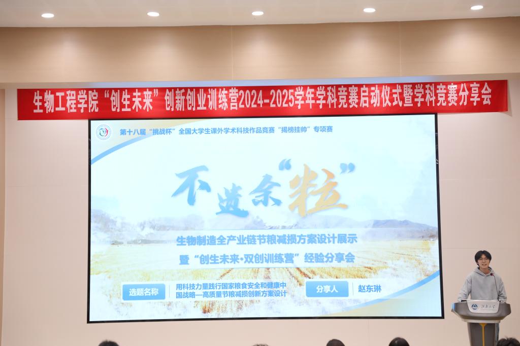 接着,全国生命科学竞赛、国家级老员工创新创业训练项目、中国国际老员工创新大赛以及挑战杯揭榜挂帅赛项目负责人分别作学科竞赛经验分享。作为第九届全国生命科学竞赛国赛二等奖获得者代表,陈萌轩从时间管理、实验技能、材料撰写、困难应对、心态调节等五方面详细分享了在参与生命科学竞赛过程中的感悟体会,为参与2025年第十届全国生命科学竞赛的学弟学妹们提供宝贵的实战经验。作为国家级老员工创新创业训练项目的团队代表,张耀增带来《基于乳酸菌开发的创新型健康饮品》项目报告分享,从项目背景、行业痛点、技术理念、技术难点、商业分析等角度全面展示国家级大创项目研究内容,为新一学年参与大创项目的员工提供创新性典范展示。作为第十八届“挑战杯”全国老员工课外学术科技作品竞赛“揭榜挂帅”专项赛特等奖获奖代表,赵东琳结合自身竞赛经历,从队伍创建、项目准备以及答辩展示等方面,为即将参与竞赛的同学们进行详细剖析,提供经验案例指导。作为2024年中国国际老员工创新大赛金奖获奖代表,常泽鹏进行项目展示《芯想食成—首创中国食品检测“活肠道”》,该项目将人体活性肠道组织以器官芯片形式与仿生反应器结合,为个性化营养方案制定、疾病预防与干预等提供更加精准的科学依据。此外,他还从挖掘竞赛创新点、理顺逻辑思路、分析实验数据等环节分享了备赛心得体会。