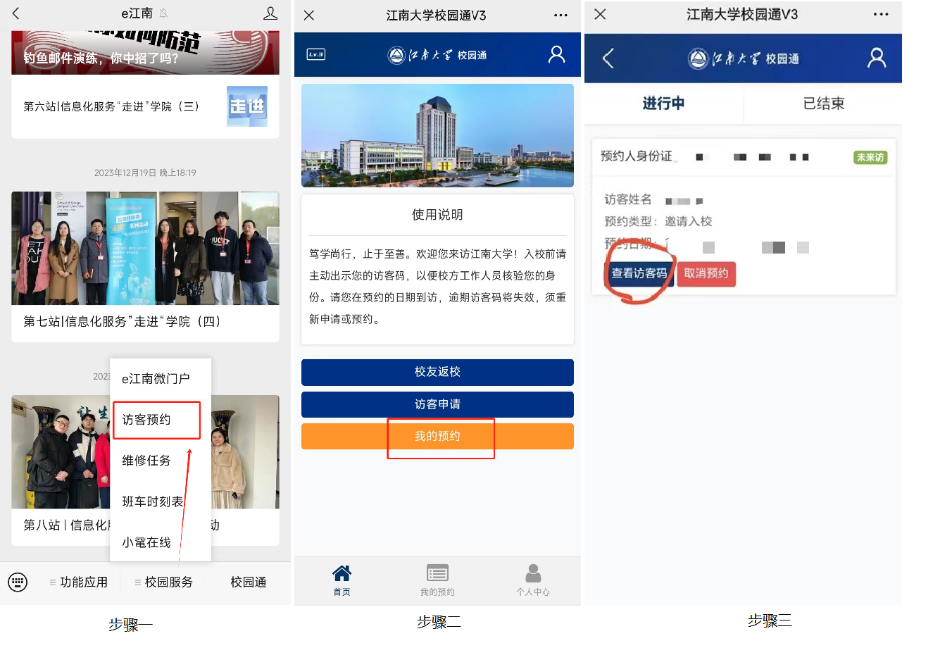 手机关注“e江南”微信公众号,点击屏幕下方“校园服务”中的“访客预约”,进入后点击“我的预约”,点击“查看访客码”即可获得访客码。进入校园时出示访客码。