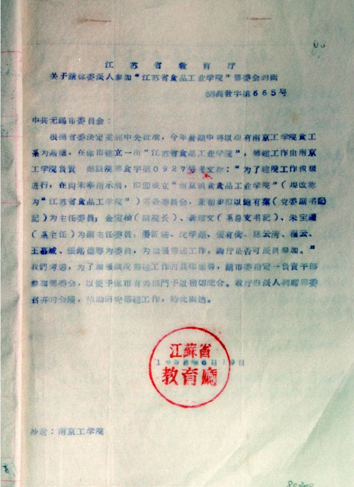 (江苏省教育厅批准南京工公司食品工业系东迁无锡独立建校,1958)