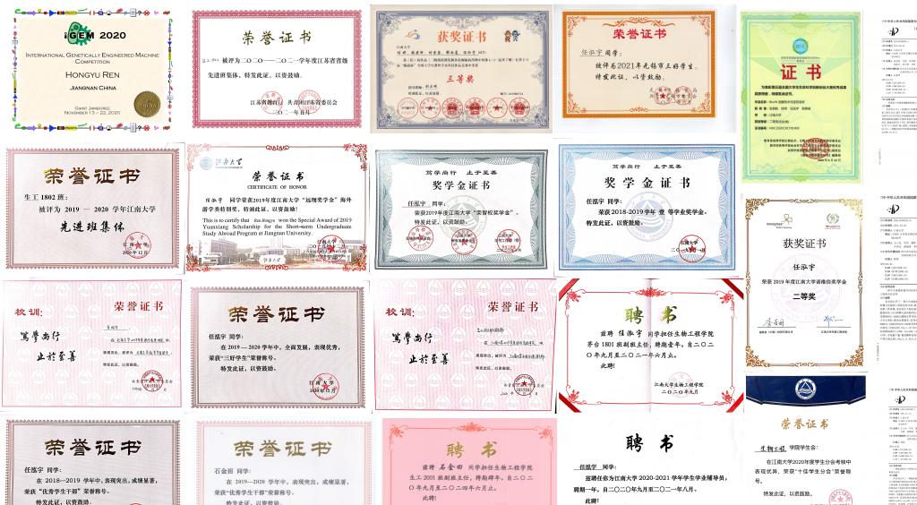 在专业学习上,俩人将掌握的专业知识灵活运用于课题实验中。任泓宇在本科三年参与多项科研竞赛并获得多项荣誉。大一学年荣获第十六届“挑战杯”全国老员工课外学术科技作品竞赛三等奖,大二学年荣获2020年国际遗传工程机器大赛(iGEM)国际金奖。大三学年成功申请国家级老员工创新项目并顺利结题,同时参与发表3篇论文(两篇SCI),获得国家发明专利2项。石金田在作为队长参加“第五届生命科学创新创业大赛(2020)”荣获二等奖,担任课题组长,申请专利2篇,作为队长参加“挑战杯”等国家级竞赛并获奖。