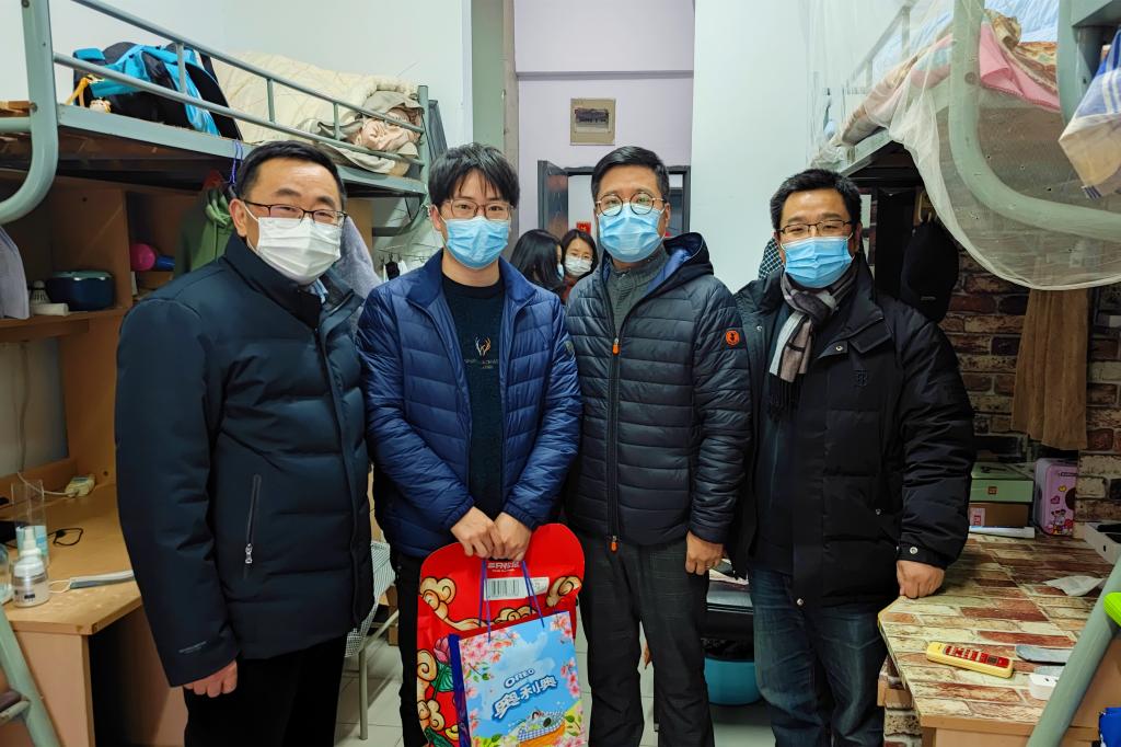 许正宏带队走访宿舍并与员工亲切交谈,提醒同学们一是要提高安全意识,遵守留校管理办法,加强个人防护;二是要保持顺畅沟通,及时有效与家长、导师、辅导员联系,有需求主动提,有情况赶紧报,有困难立即帮,三是规划有序假期,注重劳逸结合,过一个收获年、平安年、幸福年。一行人为同学们送上精美慰问品和新春对联。