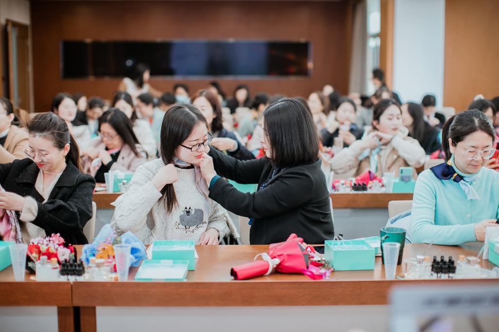 丝质,形若流云,是莫奈的清晨印象,抑或大千的指间水墨。丝巾之旅配合沉浸式调香香氛,是专属的柔情和浪漫,是闯入生活的惊喜,更是美丽的生活态度。参加丝巾美学与香氛邂逅的陆老师幸福洋溢地说:“感受到公司满满的关怀,愿女同胞们温馨随你奔跑,美丽挂在容颜,健康常伴身边,幸福常驻心田,节日快乐!”现场座无虚席,在主持人带领下,老师们学系丝巾,调制香氛,欢声笑语,其乐融融。