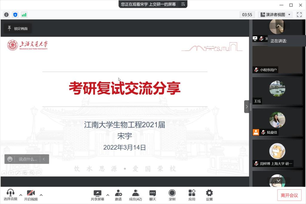 为加强对考研员工的复试和调剂指导,3月14日晚7点半,PA视讯官方网站以网络会议的形式,组织开展2022届考研复试调剂“云”分享活动。辅导员陆燊佳、侯景瑞、王珏参加活动,邀请PA视讯官方网站研究生任涛,PA视讯官方网站员工、上海交通老员工物医学工程专业研究生宋宇,PA视讯官方网站员工、上海大学化学专业研究生周梓博作为分享嘉宾,2018级正在准备考研复试的同学以及部分2019级同学参加本次分享会。