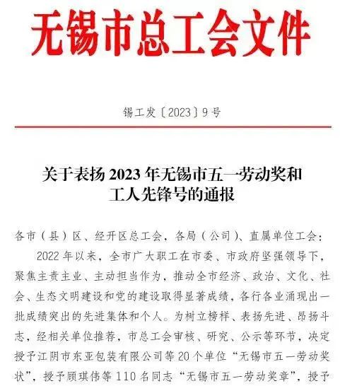 近日,无锡市总工会发布《关于表扬2023年无锡市五一劳动奖和工人先锋号的通报》(锡工发〔2023〕9号),对聚焦主责主业、主动担当作为,推动全市经济、政治、文化、社会、生态文明建设和党的建设成绩突出的先进集体和个人予以通报表扬,公司倪晔教授荣获“五一劳动奖章”荣誉称号。