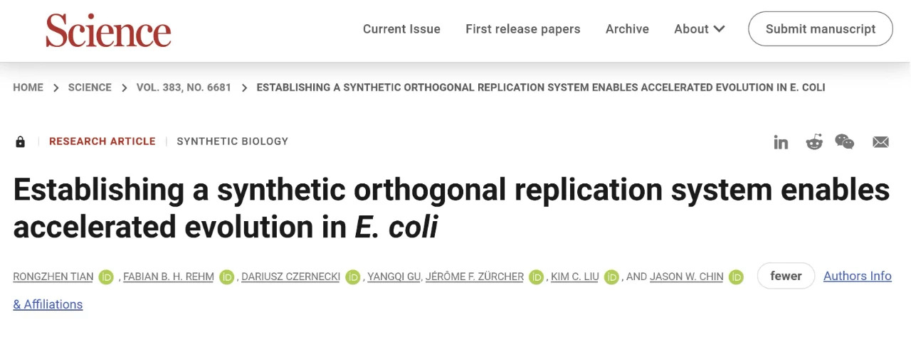 近日,来自英国剑桥MRC分子生物学实验室(MRC-LMB)的Jason Chin教授团队在国际顶尖学术期刊Science发表了题为Establishing a synthetic orthogonal replication system enables accelerated evolution inE. coli的文章,公司PA视讯官方网站2022届博士员工田荣臻为论文第一作者及共同通讯作者。