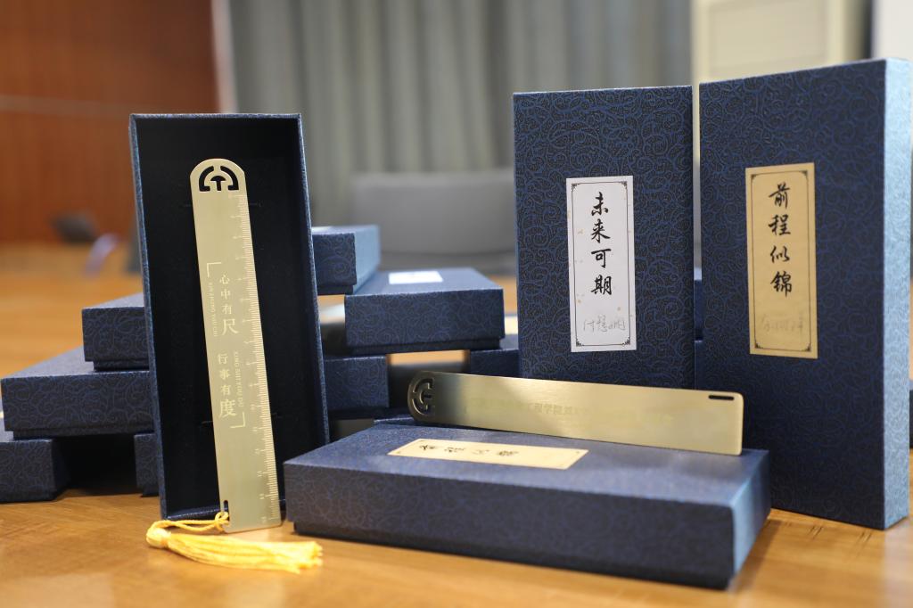 同时,本科生党支部还为毕业生党员每人定制一把集书签和度量功能于一身的黄铜尺,正面刻字“心中有尺行事有度”,背面刻以公司名称和毕业生党员姓名,盒面书写“前程似锦未来可期”,引导党员坚守纪律规矩,勇于砥砺前行。