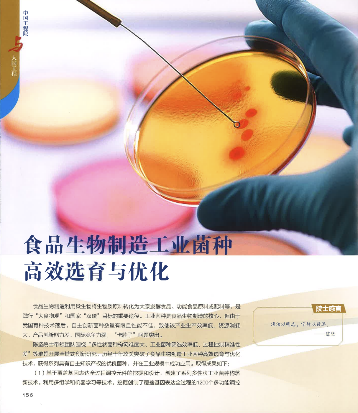 PA视讯官方网站未来食品科学中心陈坚院士团队成果《食品生物制造工业菌种高效选育与优化》成功入选100项具有代表性的工程科技成果。