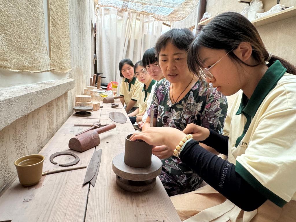 7月8日上午,实践团走进宜兴市丁蜀镇古南街紫砂壶基地进行采访和学习,体验紫砂壶传统工艺。在手工师傅的悉心指导下,实践团成员们亲身体验了紫砂壶核心工艺:选泥、配泥、和泥、拉坯、塑形和雕刻。此外,师傅还介绍了紫砂壶与茶文化密不可分的关系。历经数百年的演变,宜兴紫砂壶不仅是泡茶的器具,更是中国悠久茶文化的物理承载和精神象征。紫砂壶原料中的独特的矿物材质——紫砂泥不仅蕴藏着丰富的矿物质,还拥有良好的透气性和保温性,使得紫砂壶成为理想的泡茶工具。在长久的茶文化实践中,紫砂壶因其能更好地释放茶叶的香气和味道,而被茶爱好者所青睐。在中国茶文化的熏陶下,宜兴紫砂壶逐渐形成了一套独特的审美和仪式感。壶的形态各异,从古朴典雅到现代简洁,每一款壶形都能在不同的茶道仪式中找到其适配的茶种。如朱泥壶常用于冲泡浓香型的乌龙茶,如铁观音;而团泥壶则更适合泡制香气清雅的绿茶,如龙井。