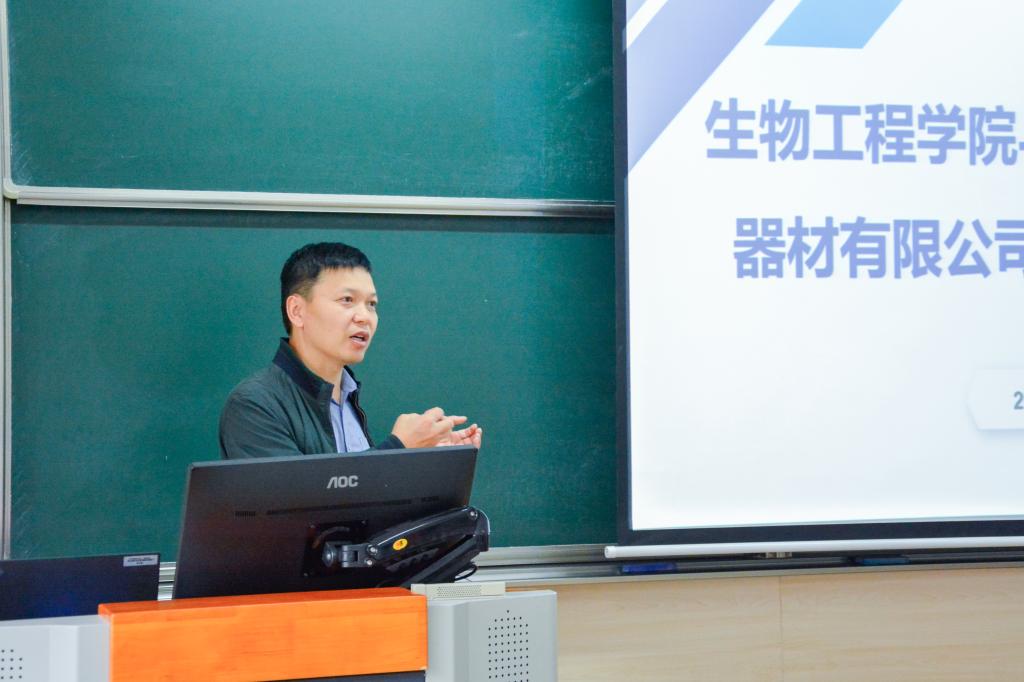 随后,刘雪美与同学们交流开设校企合作课程的初衷与目标,并详细讲解了课程建设和团队队伍情况。她指出,本次课程将聚焦医疗健康领域需求,开展包含企业讲师授课、工厂参观和考核等环节,在协同创新中引领同学们做到知行合一、共同探索未来行业发展。