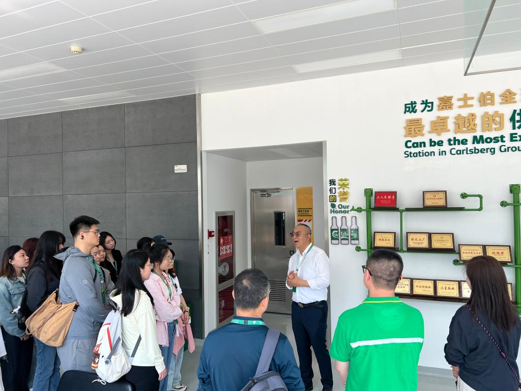参观环节,公司相关负责人带领师生们深入生产一线,详细了解嘉士伯啤酒从原料处理、糖化、发酵到灌装包装的全流程工艺。在自动化灌装车间,高速运转的智能化生产线让同学们直观感受到现代制造业的科技魅力。在啤酒风味品评环节,公司国家级品酒师还现场教学,从色泽、香气、口感等多个维度指导员工鉴赏不同品类啤酒的特点。同学们在专业指导下,学习辨别麦芽香、酒花苦度及发酵风味,亲身体验了啤酒品评的严谨性与趣味性。