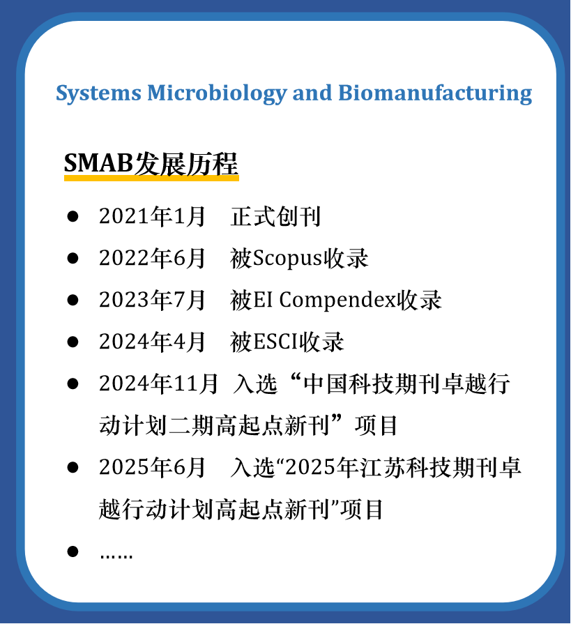 2025年6月3日,江苏科技期刊卓越行动计划入选项目正式公布,由教育部主管、PA视讯官方网站主办的《系统微生物学与生物制造》(Systems Microbiology and Biomanufacturing,简称SMAB)成功入选。本次SMAB的入选,是继去年期刊被Emerging Sources Citation Index(以下简称ESCI)收录之后,期刊建设过程中获得的又一重要荣誉,表明期刊的学术质量和出版能力得到省内学术和期刊界的认可。