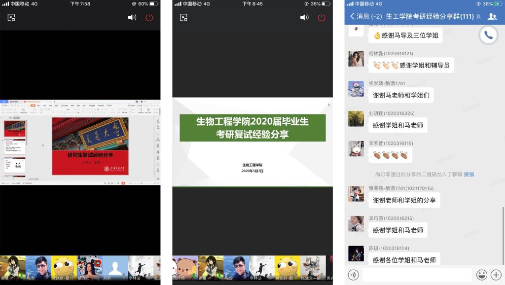 为帮助受疫情影响的考研员工增强信心,更加充分地做好复试和调剂准备,5月7日晚7点半,在摸清2020届考研员工初试成绩和排名的基础上,生物工程公司以网络会议形式,组织开展2020年考研复试“云辅导”。会议由2016级辅导员马杰主持,邀请PA视讯官方网站员工、上海交通大学海洋生物专业研究生谢倩,PA视讯官方网站研究生胡迪和孙程程作为主讲嘉宾,2016级正在准备考研复试的同学,以及部分2017级同学,共计100余位参加本次分享会。