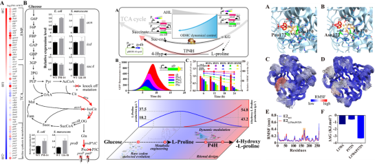 在该论文中,饶志明教授团队以反式4-羟基脯氨酸为研究目标,提出了一种通用的微生物高效合成羟化氨基酸策略。首先利用稀有密码子筛选和代谢工程改造策略有效提升底盘合成前体脯氨酸性能。其次利用基于群体感应调控线路,动态调节酮戊二酸脱氢酶活性,补充共底物酮戊二酸。最后,通过基因挖掘并结合分子动力学模拟Gromacs和Rosetta等工具改造脯氨酸羟化酶活性,增加其转化效率。最终反式-4羟基脯氨酸产量为54.8g/L,为目前报道最高水平之一。该研究为微生物高效合成羟基化高值氨基酸提供重要借鉴。