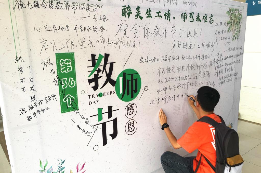 父母之外,便是师长。千言万语,唯剩感恩。上午,“醉美生工情,师恩永难忘”寄语祝福恩师活动在生工楼大厅成功举办。生工学子纷纷在展板上留下对老师的亲切祝愿,员工还精心为老师准备了节日祝福贺卡,真挚温暖的师生情洋溢在公司大厅。
