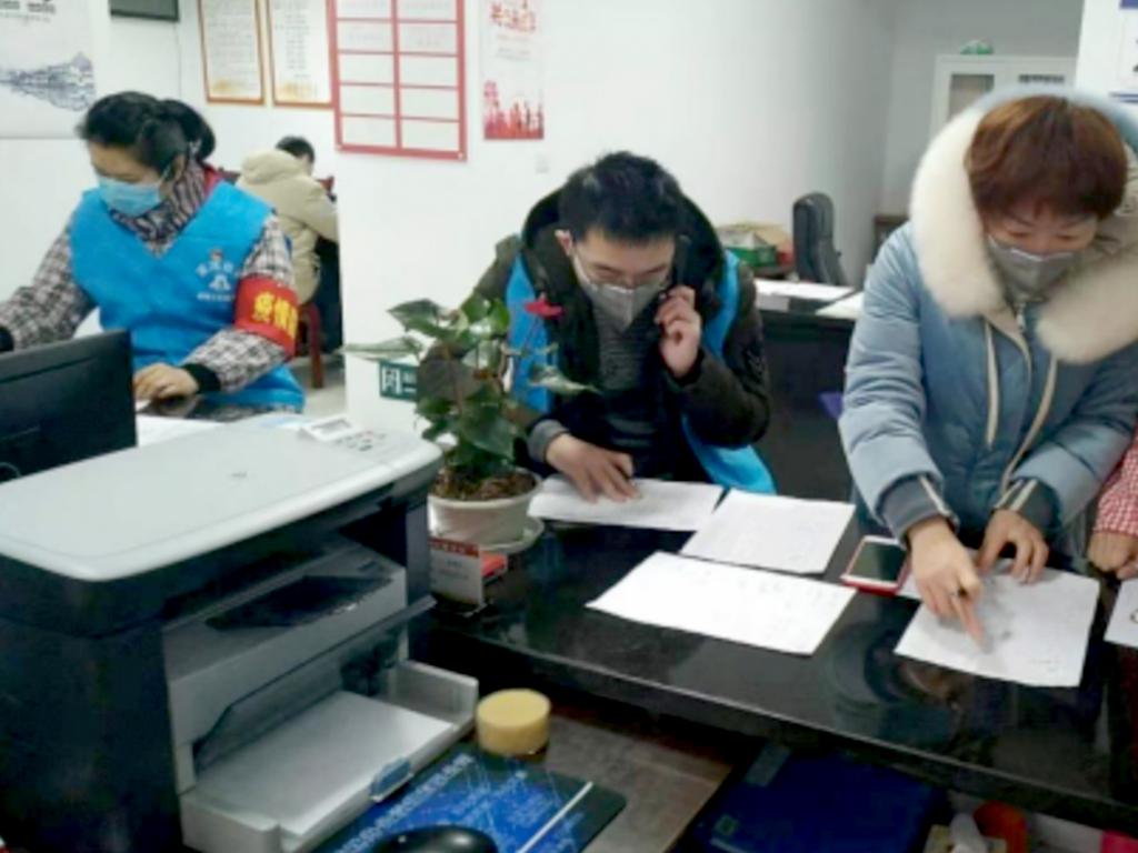 赵天一(右二)向社区住户拨打电话登记住户信息