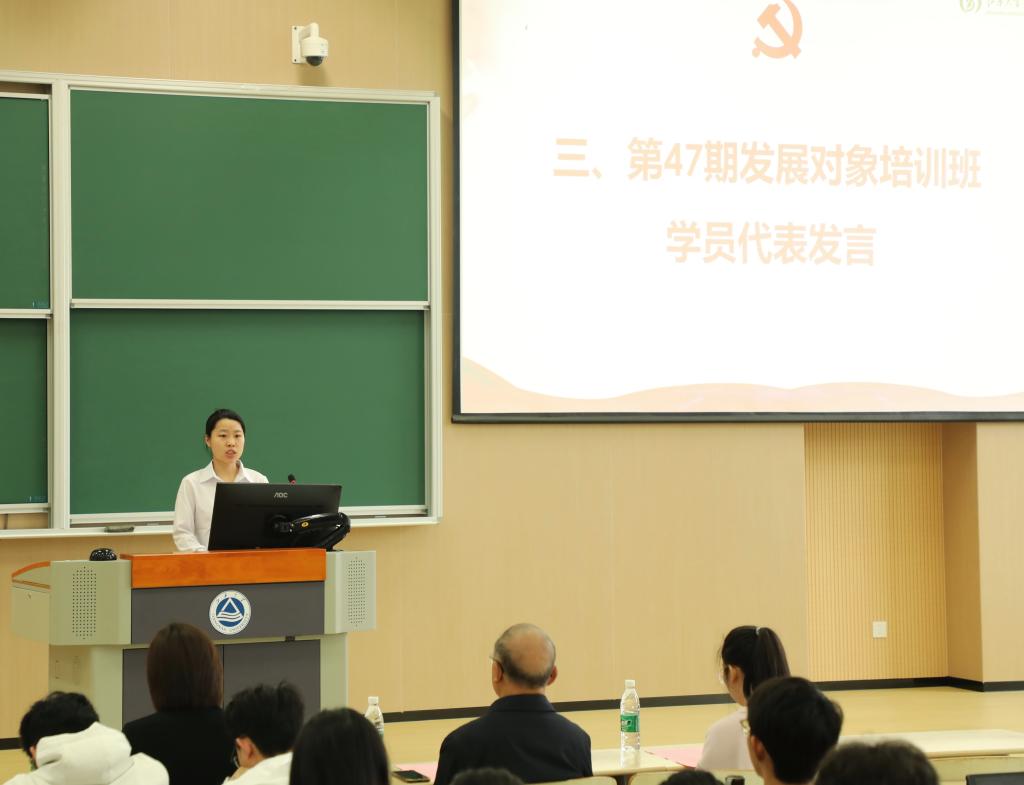 PA视讯官方网站2022级本科生刘垚代表第47期员工党员发展对象培训班新学员发言,她从遵守纪律、勇于担当、握技强能角度承诺将做到“坚定不移听党话、跟党走,行为有指南,行动有标准,怀抱梦想同时脚踏实地,争做先锋模范表率。”