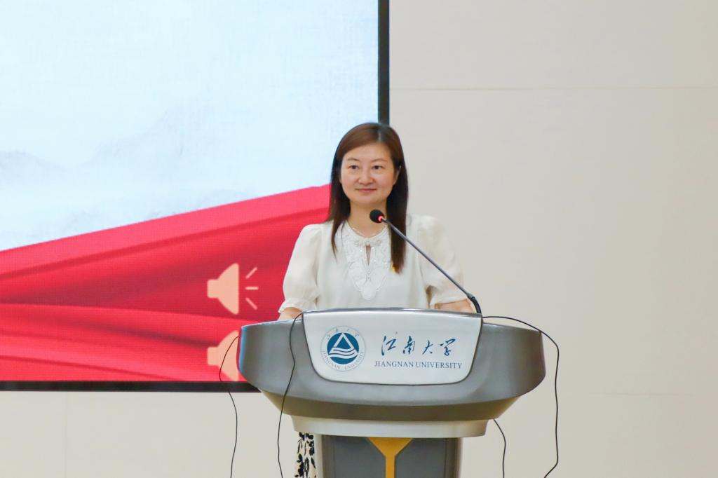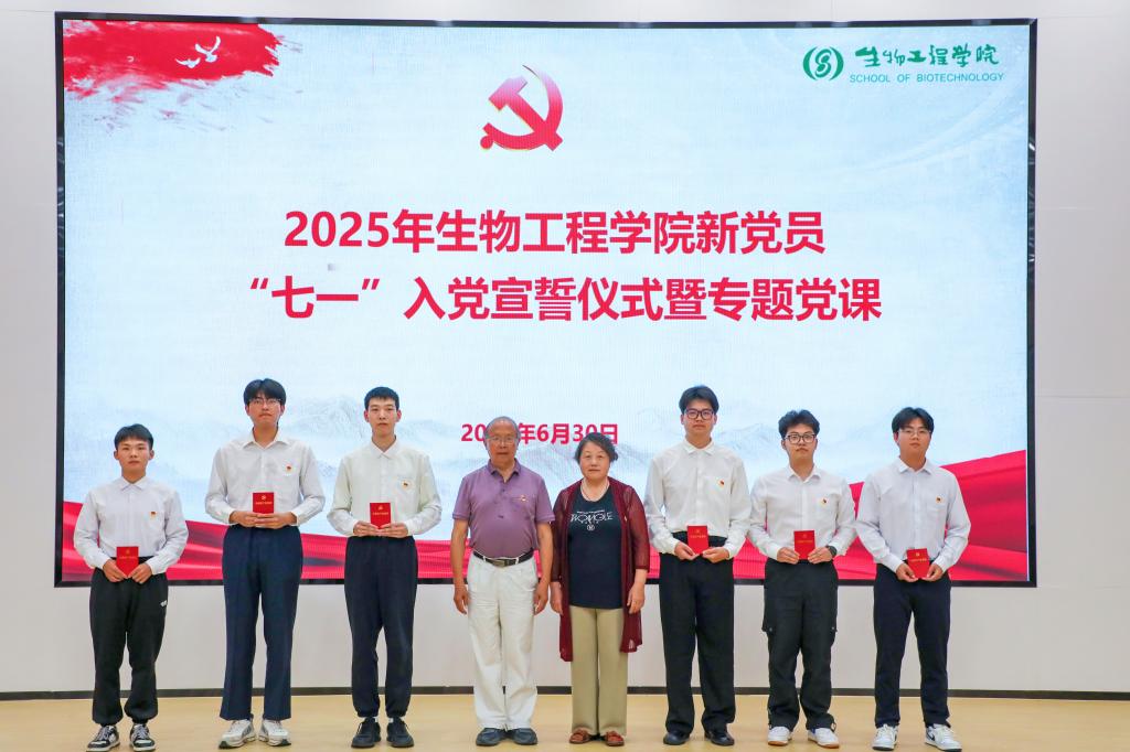 陶文沂、帅桂兰为新党员代表佩戴党员徽章。随后,由帅桂兰领誓,预备党员举起右拳,面向党旗光荣宣誓,表达对党的忠诚和为共产主义事业奋斗终身的决心。生工2301班任昱筱代表全体新党员发言,向党组织承诺将时刻以党员标准严格要求自身,奋力跑好历史的接力棒。